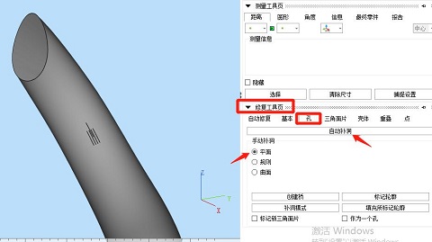 ④使用“修復(fù)工具頁”,選擇“孔”,選擇“平面”,對分割后的2個模型都進行自動補洞,也可以根據(jù)實際孔洞的起伏形狀來選擇“曲面”或“規(guī)則”來補洞。
