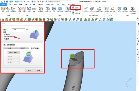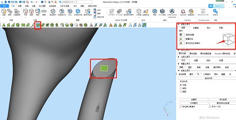 ⑤設(shè)計插銷,選擇“框選標記并重畫網(wǎng)格”功能,選擇一個模型的接觸面并框選出插銷大小和形狀??梢越柚晥D工具頁來精準調(diào)節(jié)視圖方向。
